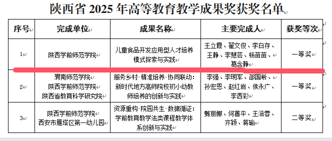 近日,陕西省人民政府办公厅发布《关于表彰2025年高等教育教学成果奖获奖项目的通报》(陕政办函〔2026〕40号),正式公布了陕西省2025年高等教育教学成果奖获奖项目名单。我校推荐的成果获3项奖励。其中,我院王立霞团队申报的《儿童食品开发应用型人才培养模式探索与实践》喜获一等奖。