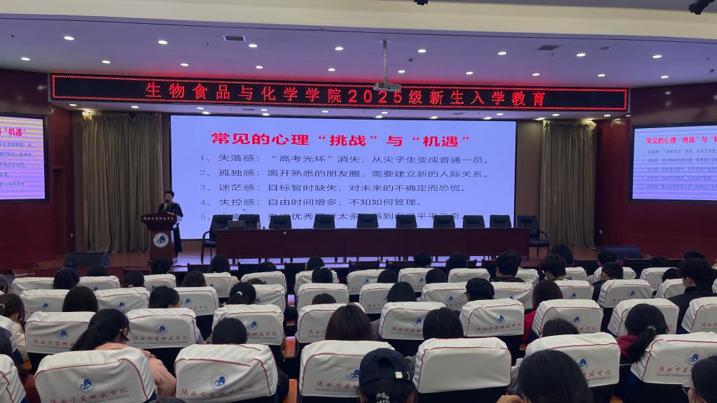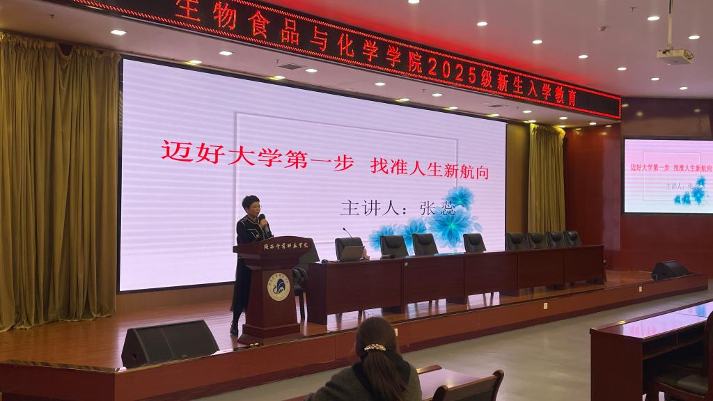 为帮助2025级新生更快适应大学生活,筑牢心理健康防线,科学规划四年学业与人生发展,10月30日,生物食品与化学学院在图书馆三楼学术报告厅隆重举办新生入学教育专题讲座。学院特邀陕西省新育心理培训学校资深讲师张蕊老师,以《迈好大学第一步,找准人生新航向》为题,为全体新生带来了一场兼具实用性与指导性的精彩授课分享。